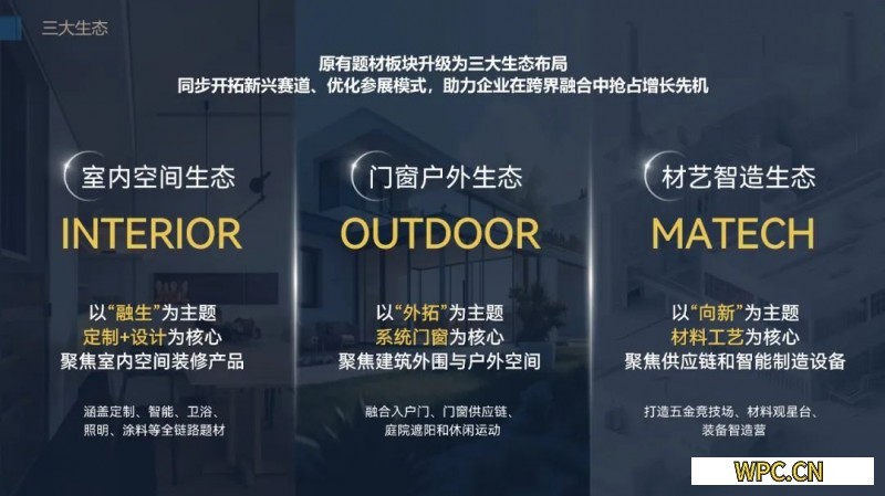本屆展會全面重塑展會布局為室內空間、門窗戶外、材藝智造三大生態,以生態化思維推動產業協同發展。室內空間生態以“融生”為主題,以“定制+設計”為核心,聚焦內裝產品,涵蓋定制、智能、衛浴、照明、商業公裝、涂料等全鏈路題材,融合設計、科技與美學,積極重構居住與生活的多維場景。門窗戶外生態以“外拓”為主題,以系統門窗、入戶門、門窗供應鏈等“大門窗”系統為核心,聚焦建筑外圍與戶外空間,充分發揮“中國門窗趨勢引領平臺”行業影響力,為行業提供建筑外圍解決方案。材藝智造生態以“向新”為主題,以材藝為核心,聚焦工藝與技術,打造“大家居建裝供應鏈星舞臺”,為供應鏈企業提供兼具專業性和商貿轉化屬性的五金競技場、材料觀新臺和裝備智造營“三大場域”。