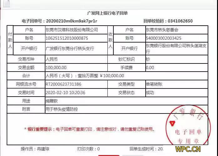 2、2月10日東莞市漢維科技股份有限公司向東莞市慈善會捐款10萬元,用于疫情防控。