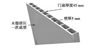 木塑門門扇大多采用擠出成型生產工藝,表面為熱轉印膜。熱轉印膜由基膠層、色膜層,以及表面UV層3層材料組成,經加熱后通過高溫加壓將轉印膜覆在門扇表面,基膠層熔化后可使色膜與材料融為一體,完成轉移印刷,其中,表面UV層起到固化和防紫外線的作用。在塑木生產過程中除少量粉塵和噪聲污染外,無廢氣、廢渣排放,冷卻水可以循環利用; 膠合媒介是熱塑性聚合物,產品生產過程中不需要另外使用膠黏劑,因此無甲醛等有害物質釋放。門扇的造型、肌理、色彩等均可通過設計模具和添加色料預設完成,其制品表面平整光滑,如果沒有特殊要求,不需要對制品進行裝飾和保護方面的二次加工。相對于傳統的木質門而言,木塑門的制造工藝和生產流程簡單,生產過程中能源消耗量低。生產工藝流程如下: 將熱塑性塑料/高聚物、木粉、填充料與其他功能型助劑放入高速混合機,組合均勻后經螺旋自動上料機投入到擠出機料斗,同時將擠出機溫度預先設定并保溫,經擠出機將原料熔融塑化后,通過專用模具擠出進入真空定徑裝置,冷卻定徑成型后再通過牽引機將其牽出,進入自動切割機按預先設定的長度實現自動切割至堆放架,然后將通過表面處理的合格產品入庫,次品及邊角料經粉碎、磨粉后可直接循環利用。木塑門剖面示例: